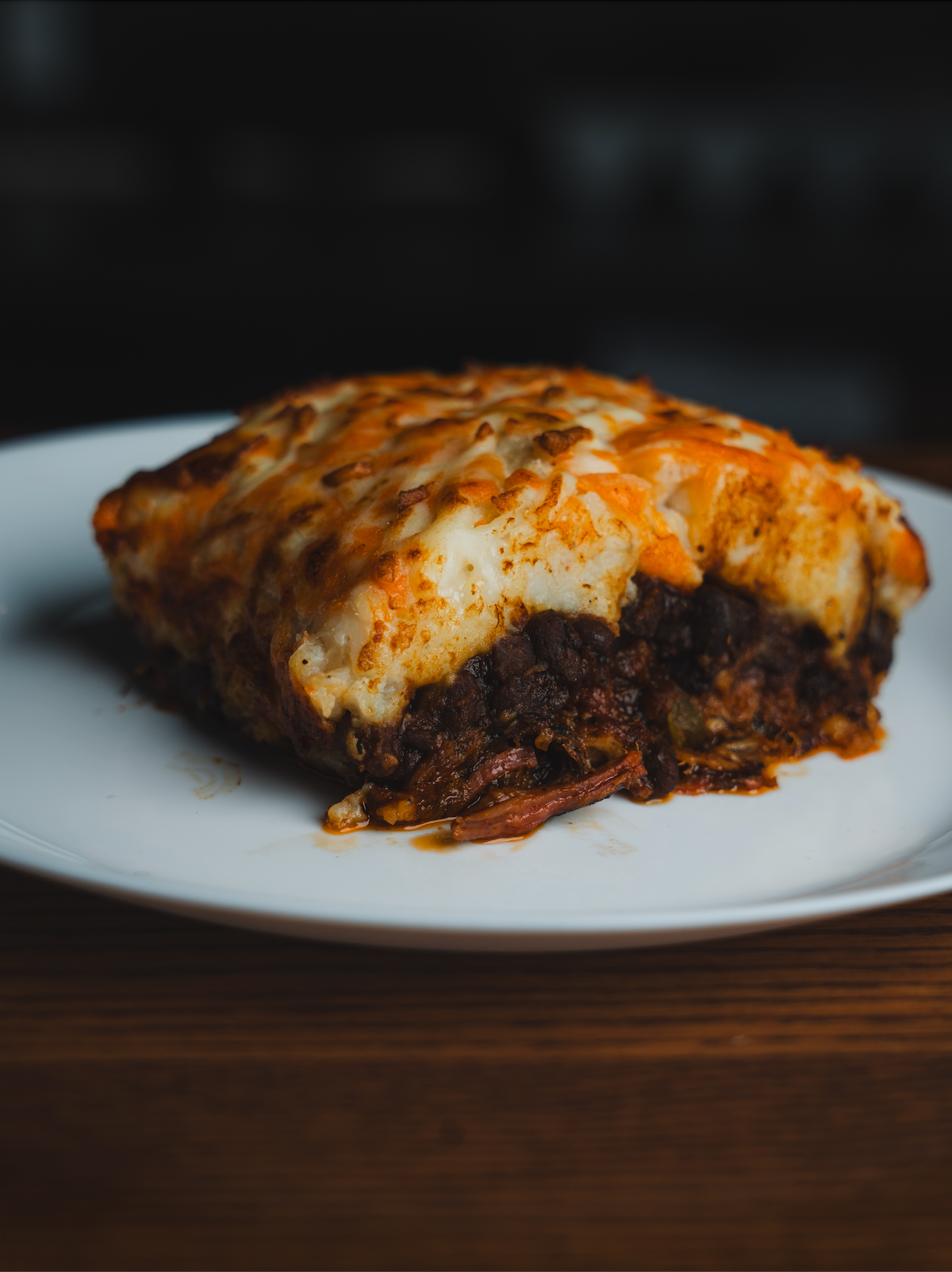 Our take on shepherd's pie, our delicious pulled pork smothered in Maple BBQ sauce, topped with our signature smoked beans, pickled jalapenos and covered with our creamy mashed potatoes and marbled cheddar.