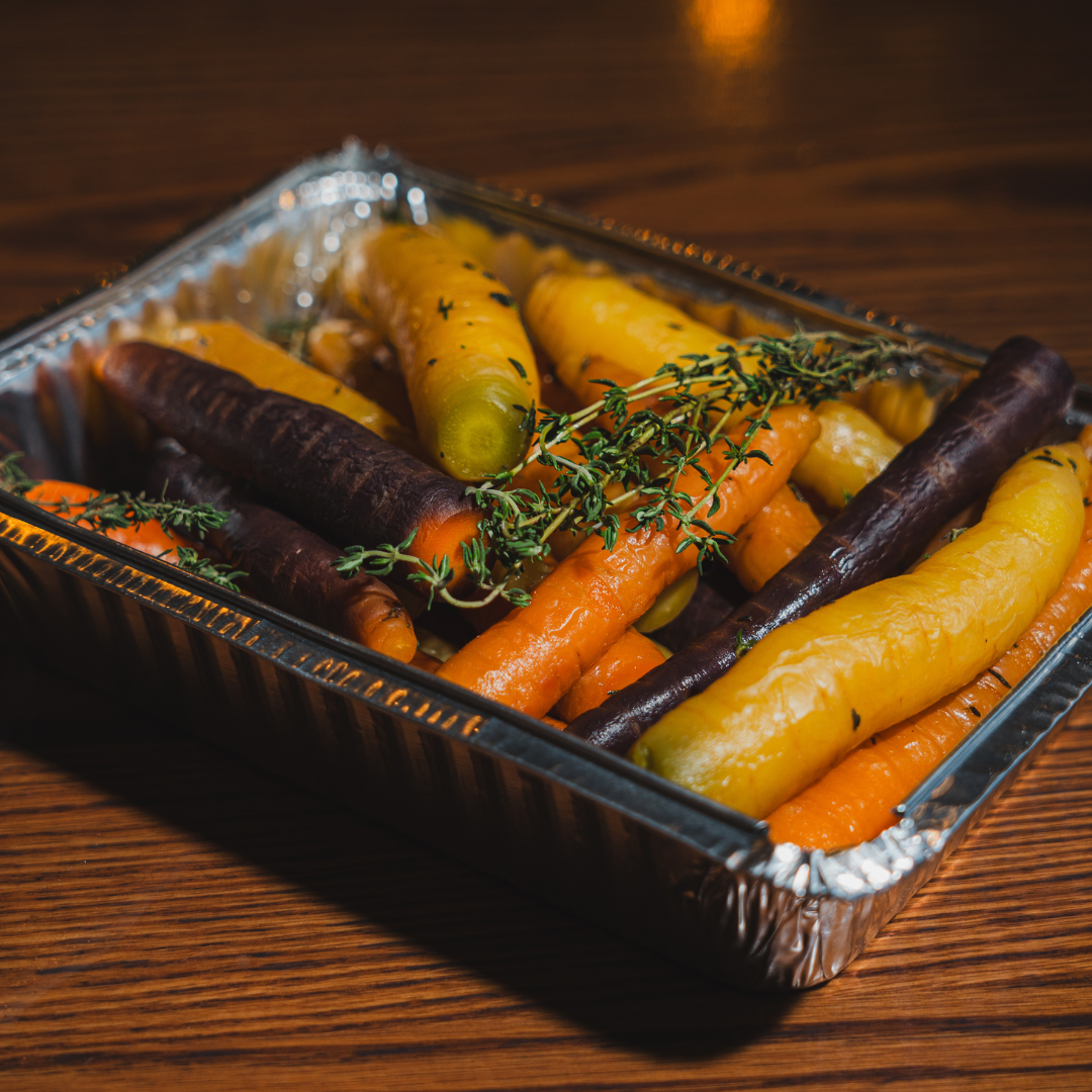 Our roasted carrots vegetables, glazed in maple syrup, herbs and spices. Just reheat and eat! (Feeds 4-6 people)